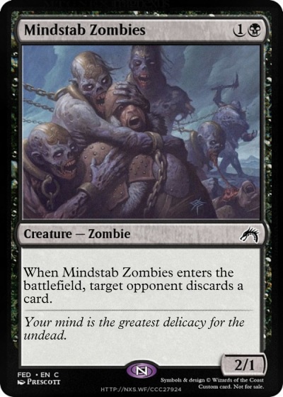 When Mindstab Zombies enters the battlefield, target opponent discards a card.